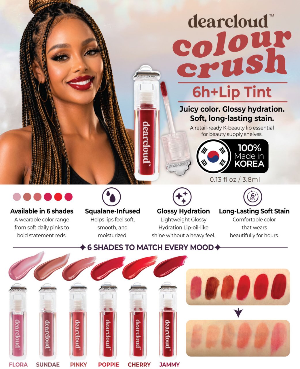 Dearcloud Colour Crush Flora Lip Tint This is an airy, light, water-based tint for an effortless, juicy stain that lasts 6+ hours. It's infused with squalane, which promotes a dewy, youthful, hydrating finish. 3.8 ml / 0.13 fl oz -Mineral oil: sunflower seed oil -Cruelty-free -Vegan -Paraben, gluten & sulfate-free -Imported