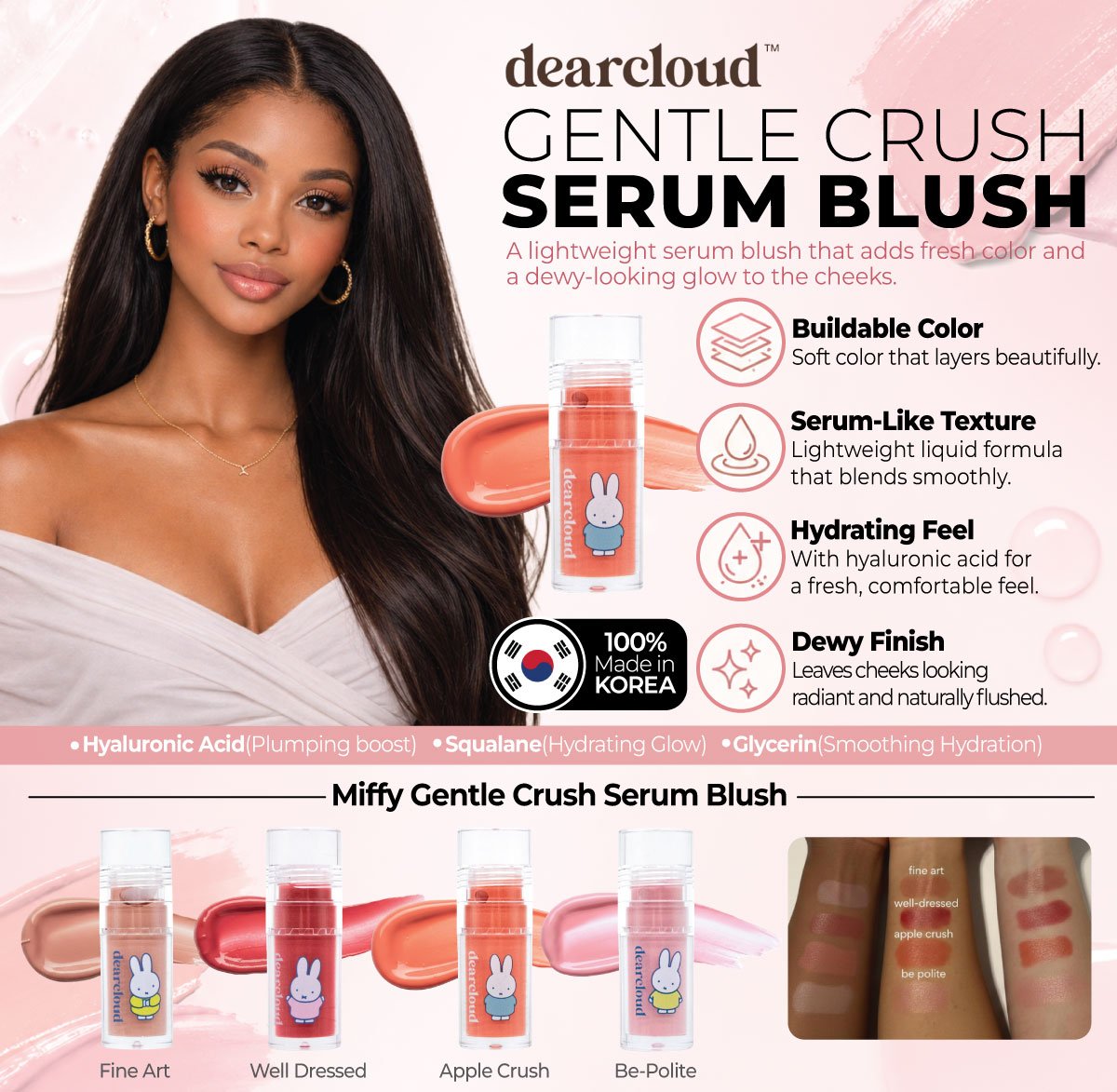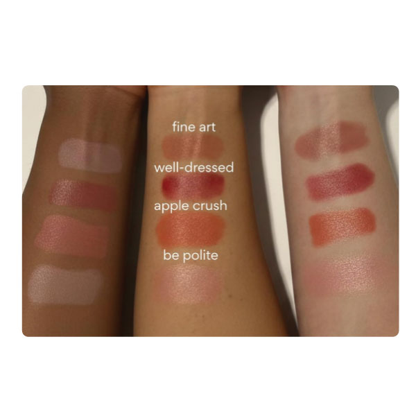 Apply a small amount to the back of your hand. Using your fingers or a brush, dab onto the apples of your cheeks, blending outwards towards your hairline. For a more intense look, build up the color in layers. Can also be used as a lip and cheek balm or mixed into your base for a blurred-from-within effect.