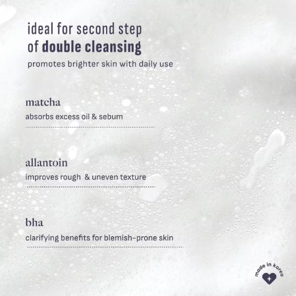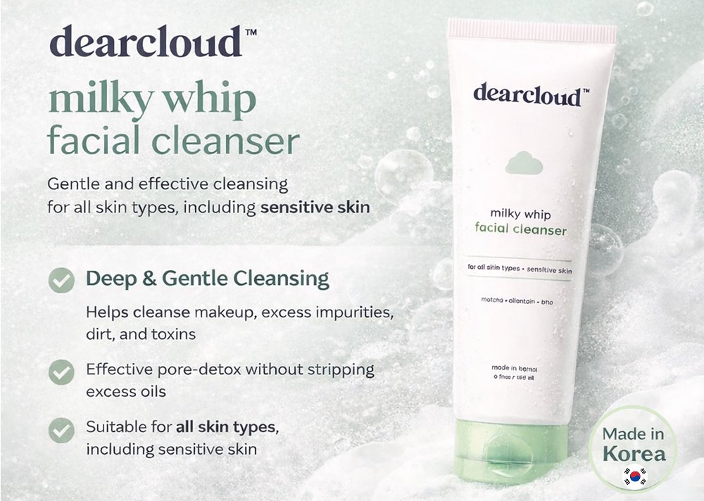 Dearcloud's signature Matcha Milky Whip Facial Cleanser helps effectively remove makeup and excess impurities. Powered by Allantoin and BHA to help decrease the appearance of blemishes and dullness. 5fl oz(150ml)